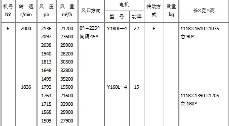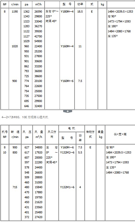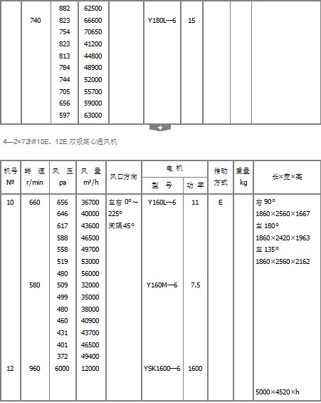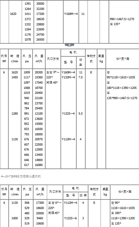 1、風(fēng)機(jī)采用雙吸入進(jìn)氣,機(jī)號(hào)有6E、8E、10E、12E、14E、16E、18E、20E。