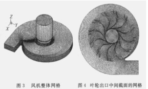采用 F L UENT 軟件計算風(fēng)機內(nèi)部的非定常流動來獲取流場和聲源信息。風(fēng)機計算區(qū)域主要分為三個部分: 進氣段、葉輪( 包括旋轉(zhuǎn)擴壓器) 和蝸殼。為了提高收斂速度, 忽略了進風(fēng)口和旋轉(zhuǎn)葉輪套接部分的內(nèi)泄漏流動。為適應(yīng)風(fēng)機內(nèi)部結(jié)構(gòu)的復(fù)雜性,采用多塊網(wǎng)格生成方法生成高質(zhì)量網(wǎng)格?紤]到不同流動區(qū)域的不同重要性, 對葉輪內(nèi)部、蝸舌壁面附近的網(wǎng)格節(jié)點進行了加密控制和非等距處理。為方便, 取葉輪旋轉(zhuǎn)軸中心線為 Z 坐標(biāo)軸, 進口氣流沿 Z軸正向流向 Z 軸負向, 輪盤內(nèi)壁面為坐標(biāo) Z = 0 平面。各部位的具體網(wǎng)格節(jié)點數(shù)分別為: 進氣部分約 6萬個, 葉輪部分約 61 萬個, 蝸殼部分約 23 萬個。整機網(wǎng)格節(jié)點總數(shù)約 90 萬個。風(fēng)機的計算網(wǎng)格模型如圖 3、 4 所示。圖.jpg)