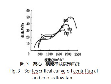 從圖 4 可以看出: 橫流風(fēng)機(jī)在離心風(fēng)機(jī) 3 種不同轉(zhuǎn)速下的串聯(lián)臨 界曲線 的形狀 亦非常 相似, 離心 風(fēng)機(jī) 的轉(zhuǎn)速 越高 串聯(lián)臨 界點(diǎn)亦越高; 對(duì)某一轉(zhuǎn) 速下的串 聯(lián)臨界曲線 來說, 串 聯(lián)臨界點(diǎn) 呈駝峰狀。比較圖 3、 4 可知, 橫流風(fēng) 機(jī)與離心風(fēng)機(jī)在串聯(lián)中的前后圖位置不同, 其對(duì)應(yīng)的串聯(lián)臨界曲線的形狀也不相同。在大量試驗(yàn)的基礎(chǔ)上 發(fā)現(xiàn), 串聯(lián) 風(fēng)機(jī)在臨 界點(diǎn)以上運(yùn) 行時(shí), 串 聯(lián)效率在 兩單機(jī)的效率之間, 而在臨界點(diǎn)一下運(yùn)行時(shí), 串聯(lián)效率 很低, 甚至低于串聯(lián)風(fēng)機(jī)中效率較低的單機(jī)。