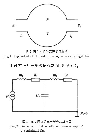 在聲學元件的線度比聲波波長小得多時 , 可將聲學元件看作是集中參數(shù)系統(tǒng) 。 所以得到如圖 1 所示的離心風機渦殼類比聲學等效圖 , 它由截面積為) 長度為 l1 和 l2 的短管與容積為S1 和 S2( 半徑為 α 、V的腔體組成 [ 6] 。 同時假定 :