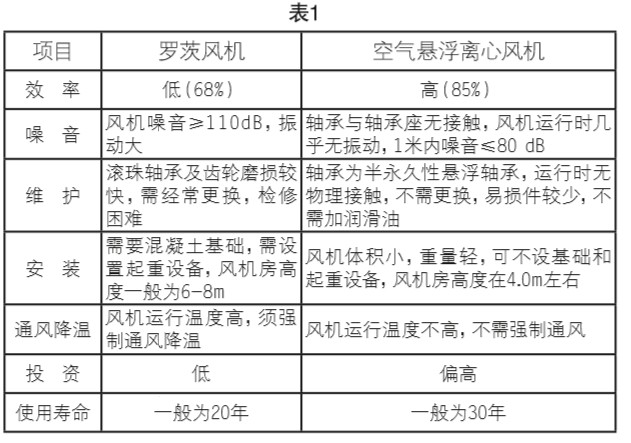 城鎮(zhèn)污水處理廠鼓風(fēng)曝氣系統(tǒng)常用的鼓風(fēng)機(jī)有羅茨風(fēng)機(jī)和離心風(fēng)機(jī)。羅茨風(fēng)機(jī)雖然價(jià)格低,但噪音較大,本次技術(shù)改造采用高效節(jié)能、結(jié)構(gòu)簡(jiǎn)單、體積小、重量輕、低振動(dòng),低噪音的空氣懸浮離心風(fēng)機(jī)。曝氣系統(tǒng)可采用盤(pán)式曝氣器和管式曝氣器,其中盤(pán)式曝氣器相對(duì)布?xì)饩鶆,氣水狀態(tài)好,在國(guó)內(nèi)使用廣泛,有成熟經(jīng)驗(yàn)。推薦采用盤(pán)式微孔曝氣器?諝鈶腋‰x心風(fēng)機(jī)選用進(jìn)口設(shè)備,配備變頻器,羅茨風(fēng)機(jī)與空氣懸浮離心風(fēng)機(jī)性能比較見(jiàn)表1:
