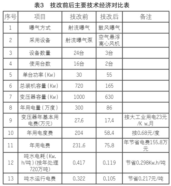 1、日處理能力2萬(wàn)噸污水廠采用射流曝氣系統(tǒng)單項(xiàng)年實(shí)際用電量300萬(wàn)度,技改采用空氣懸浮離心風(fēng)機(jī)曝氣后,單項(xiàng)年實(shí)際用備注電量為75.8萬(wàn)度,曝氣單項(xiàng)噸水電耗由0.417Kw.h/噸降為0.119Kw.h/噸。