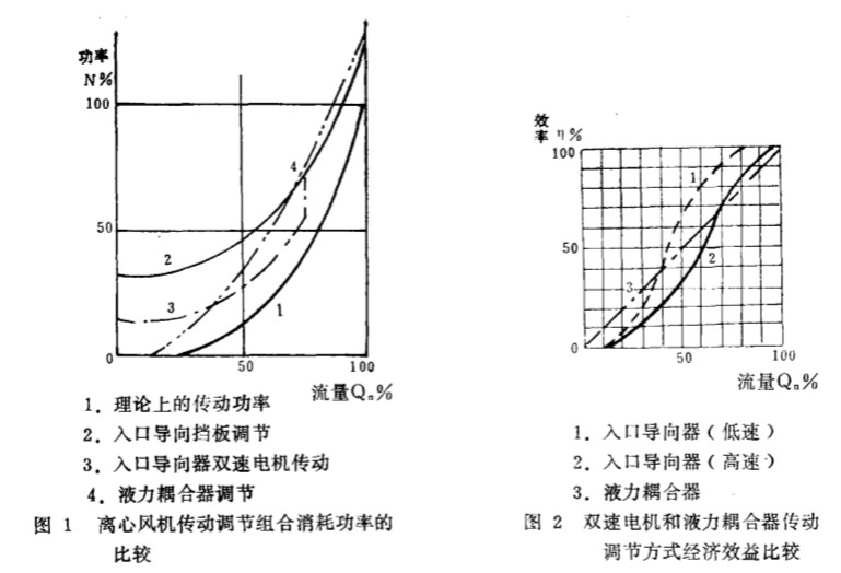 ( l ) PA M 雙 速 電 機(jī)傳動 調(diào) 節(jié) PA M ( Po le 一A m p litu d e 一M o d u la tio n 即 極 幅 調(diào) 制 ) 單繞組雙速 電機(jī)是變極調(diào)速應(yīng)用較為廣泛的一 種形式 , 在電機(jī)轉(zhuǎn)速改變時 , 基本保持額 定滑差 , 無轉(zhuǎn)差功率損耗 , 所以屬 高效調(diào)速 裝置 。 單繞組雙 速 電機(jī) 自 195 7 年問世 以來 , 國 外已廣泛應(yīng) 用 , 近 年來國內(nèi)也正在推廣應(yīng)用。 雙速 電機(jī)傳動實(shí)際上是定級調(diào) 速 , 必須和 風(fēng)機(jī) 入口 導(dǎo)向擋板配 合使用 , 設(shè) 計時按雙速設(shè) 計 , 可勸兩種極數(shù)作經(jīng)濟(jì)合理選擇。 在規(guī)定的兩檔轉(zhuǎn)速條件‘ 下 , 當(dāng)入 口 導(dǎo) 向擋板全開 時風(fēng)機(jī) 效率最 好; 當(dāng)導(dǎo) 向擋板關(guān)小時 , 仍然 存在著節(jié)流損 失, 風(fēng)機(jī)的 效率 也會 下 降。 但 由于有 兩檔 轉(zhuǎn)速 可調(diào) 節(jié), 風(fēng) 機(jī)在整個負(fù)荷范圍內(nèi)的效率是有所改善 。 用PA M雙速 電機(jī)驅(qū)動風(fēng)機(jī)是一種十分有效的動力裝置 , 可 以獲 得顯著的效益 。 但 對 已 定型的單速 電機(jī)改成雙速 電機(jī) , 要得到理 想的經(jīng)濟(jì)方案就 比 較困難 , 條 件亦較苛刻。 ( 2 )調(diào)速 型 液 力搞 合 器 這是一種 以液體作為介質(zhì)傳遞功 率的新型 傳動裝置 , 在主動 軸轉(zhuǎn)速不變的條件下 , 只 要改變液力 藕合器工作腔 中工作液體 的充滿度 , 就能無級地改 變從 動軸的轉(zhuǎn)速 。 液力禍合器的調(diào)速范圍為 20 一 97 % , 有 速度損失 , 無法達(dá) 到額定速度運(yùn)轉(zhuǎn), 轉(zhuǎn)差功率均 以發(fā)熱形 式損耗掉 。 最大 的功率損失為所傳的額 定功率的 15 % 左右。 所 以 屬 于 低效調(diào) 速裝置。 由于調(diào) 速型液力藕合器 的主從動 l汁輪之 間不 存在任何的機(jī)械聯(lián)系 , 所 以它具 有 如 下 優(yōu) 點(diǎn): 過載保護(hù)簡單 、 節(jié)能、 空載啟動電動機(jī) 、 緩慢加速風(fēng) 機(jī)、 工 作安 全 可 靠 、 使 用 壽 命 長等 。 2 . 雙速電機(jī)和 液力藕合器 調(diào)速 裝邏的輸入功率和效率比較 圖 1 和圖 2 表示 了隨實(shí) 際負(fù)荷變化 , 離心風(fēng) 機(jī)采用 和 效率的曲線 , 并明顯地 電機(jī)傳動調(diào) 節(jié)和采用 液力藕合器變速調(diào) 節(jié)方式組 合所 耗功率 入 口 導(dǎo) 向擋板調(diào)節(jié)的離心式風(fēng)機(jī)采 用雙速 電機(jī)時的優(yōu)越性。 其流量調(diào)節(jié)范圍大 , 調(diào) 節(jié)效率最高。 ‘它是火 電廠 ’ 鍋爐風(fēng)機(jī)的理 想調(diào) 節(jié)方式。