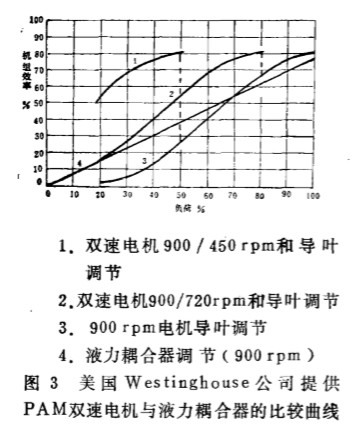 從 圖 3 所示 , 美國西 屋公司 提供的 四種 電動機(jī)驅(qū)動風(fēng)機(jī)的曲線中 , PA M雙 速 電機(jī) 傳 動 調(diào) 節(jié)的效率最高 , 在90o r p m 電機(jī) 驅(qū)動 下的風(fēng) 機(jī)采用入 口導(dǎo) 向擋板調(diào) 節(jié)在75 % 負(fù)荷 以上 , 比采用液力藕合傳動調(diào) 節(jié) 效 率 高; 在75 % 負(fù) 荷 下 PA M 雙速 電機(jī) ( 90 0 / 7 2or p m ) 的 效 率可達(dá) 80 % , 而單一 的入 口導(dǎo) 向擋板和 禍 合器 傳動調(diào) 節(jié)的效 率 只有 60 % 。 因此 , 風(fēng)機(jī)在高效 下 長 期運(yùn)行 , 就 能節(jié)省相 當(dāng)?shù)碾娏?。 為 了配 合調(diào) 峰 , 閘北發(fā)電廠 將 一 臺125 M W 機(jī)組的兩 臺吸風(fēng) 機(jī)改為 雙 速 電 機(jī) ( 740 / 5 60 r p m ) , 取 得 了 明顯的節(jié) 電效果 。 閡行 發(fā) 電 廠 一 臺36 0 t/ h 鍋爐 送、 吸 風(fēng)機(jī)采用Y O T C型 液力藕合器 , 在低負(fù)荷 時 , 其效率將 比單一 的擋 板調(diào) 節(jié)高 1 . 53 ~ 2 . 01 倍 , 而其耗功僅為導(dǎo) 向 擋板調(diào) 節(jié)的 65 . 3 ~ 53 . 1 %
