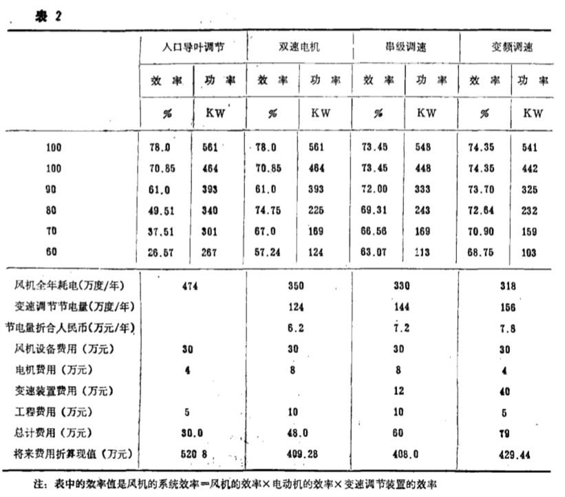 我國(guó)還沒(méi)有大容量的變頻調(diào) 速 裝 置 產(chǎn) 品 , 且因其成 本高, 增 加設(shè)備較多 , 對(duì)維修 人員的要求也較高 。 因而 , 迄今我國(guó)電廠風(fēng) 機(jī)還沒(méi)有采用此型 變速裝置 。 但是變頻調(diào)速 是 交流電動(dòng)機(jī)調(diào)速的最 新技術(shù), 與其它 調(diào) 速 裝置相 比 , 性能最佳, 因 此應(yīng)積極加 以研究 和開(kāi)發(fā) 。 表 2 為我們對(duì) 某電廠一 臺(tái)鍋爐引風(fēng)機(jī)進(jìn) 行 改造設(shè)計(jì) 時(shí), 所做的幾種 調(diào)節(jié)方式的 經(jīng)濟(jì)比較結(jié)果 。 由表可見(jiàn): 三 種交流變速裝置均 可取得顯著的節(jié)電效果, 其 中又 以變頻調(diào)速 為最佳 。 但由于變頻調(diào) 速 裝置費(fèi)用 太高, 其 綜合經(jīng) 濟(jì)指標(biāo)一將來(lái) 費(fèi)用折 算現(xiàn)值反而不如 串級(jí)調(diào) 速和雙 速 電機(jī) (將來(lái)費(fèi)用折 算現(xiàn)值越 低越好) 。 因 此, 必須 抓 緊研究降低變頻調(diào) 速裝置 的成本 , 以利 今后推廣 應(yīng)用 。 表 2 中的節(jié)電量 是按 全年 運(yùn) 行 700 0 小 時(shí) 、 風(fēng)機(jī)風(fēng)量富裕量為10 %計(jì) 算的 ; 負(fù)荷分配 為帶 10 0 % 、 90 % 、 80 % 、 70 % 的負(fù)荷各為1/ 6 時(shí) 間, 其 余 1鄺時(shí) 間帶60 % 的負(fù)荷 。 電價(jià)按 50 元/ 千度計(jì)算 。 將來(lái)費(fèi)用折 算現(xiàn)值的計(jì)算 公式為: