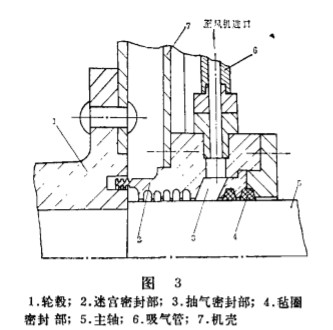 FW 系列風(fēng)機(jī)上采用的軸端密封實(shí)際上是 集迷 宮密封 、 抽氣密封與 氈圈密封為一體的組 合式密封 。 該密封結(jié)構(gòu)簡單 , 安裝 、 維護(hù)非常 方便, 基本上解決了風(fēng)機(jī)的泄漏 問題, 取得 了 較好的使用效果。