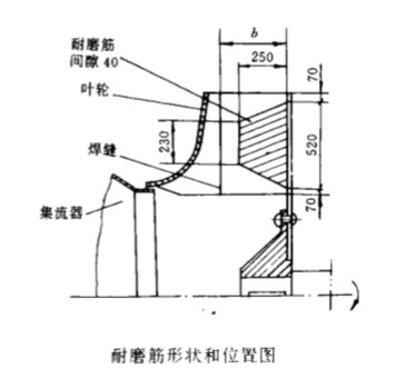 3 . 3 加焊耐磨筋 風(fēng)機葉 輪 葉 片 全 部 更 換 焊 接 完 后 , 用 中6m m 的不 銹鋼鋼筋制 作 耐 磨筋 , 耐磨筋 兩邊 用 不銹鋼焊 條 (或 T D O 一 3 型耐 磨焊條 )連續(xù) 焊接 到葉 片上 , 耐 磨筋 的形狀和 位 置 見附 圖。