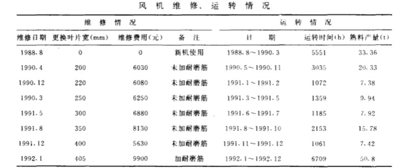 從 1988 年 8 月投 產(chǎn)至 19 92 年 12 月 , 風(fēng)機 葉輪葉 片共更換 7 次 , 特別是 1991 年葉片更換5 次 , 全 年風(fēng)機 運轉(zhuǎn) 69 20 h , 共生產(chǎn)熟料 47 · 6 萬t , 平均 每更 換一次 葉 片風(fēng) 機 運轉(zhuǎn) 1384 h , 生產(chǎn)熟料 9 . 52 萬 t , 全年維修費用 3297 0 元 /a 。 從 1 9 9 2 年 1 月風(fēng)機 葉輪 葉 片加焊 耐磨 筋 至 12 月 , 風(fēng)機共運 轉(zhuǎn) 6 7 0 9h , 生 產(chǎn)熟料 50 . 8 萬 t 。 比 1991 年多生產(chǎn)熟料 41 . 28 萬 t , 葉輪葉 片 提高 壽 命 4 . 3 倍 , 19 92 年維修費用 9 9 0 。 元 , 比9 91 年可節(jié) 省維修費用 2 . 54 萬 元 , 中間可減 少 4 次停機檢修時 間 , 增 產(chǎn) 熟料 5 . 31 萬 t , 葉 輪 的 使用 壽命可 延長 0 . 4 倍 , 風(fēng) 機維 修運轉(zhuǎn)情 況 見下表 。