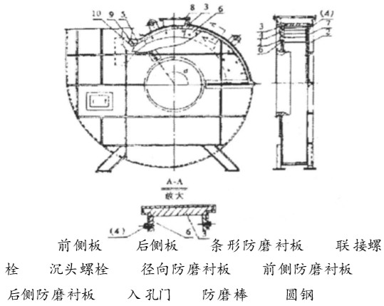 3. 1 傳統(tǒng)檢修方法 風(fēng)殼磨損即產(chǎn)生泄漏, 必須及時(shí)進(jìn)行修復(fù), 常 采用外部貼補(bǔ)和堆焊的臨時(shí)辦法進(jìn)行處理。但磨 損嚴(yán)重, 則要將風(fēng)機(jī)解體后進(jìn)行修復(fù)。把被損壞 的殼體進(jìn)行堆焊或挖補(bǔ)復(fù)原, 再將磨損的徑向防 磨襯板用氧、乙炔焰自殼體上切割下來, 按原樣裝 上新的防磨襯板。但這種方法, 極易造成風(fēng)殼變 形, 導(dǎo)致密封不嚴(yán)。 3. 2 風(fēng)殼內(nèi)敷設(shè)耐磨襯板 為解決風(fēng)殼的磨損問題, 提出了在風(fēng)殼內(nèi)敷 設(shè)耐磨襯板的方法, 即在風(fēng)殼內(nèi)敷設(shè)耐磨合金襯 板[2] , 敷設(shè)前要將原來的徑向弧形襯板從殼體上 切割下來, 再將鑄造的耐磨合金襯板一件一件地 用銷釘與殼體固定[3] , 采用這種方法在施工中發(fā) 現(xiàn)如下問題: