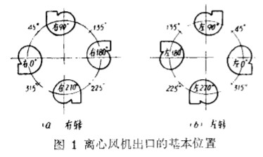 經(jīng)過換算, 在標(biāo) 準(zhǔn)狀態(tài)下 , _ L 述 三臺離心風(fēng)機的 比轉(zhuǎn)數(shù) ( n , ) 都很小, 按 國際單位制 (5 1) 基本上是在 1 . 弱一 6 . 14 ( 相當(dāng) 于 Mk fs 制 為 10~ 35 )范圍內(nèi)。 這 三臺風(fēng)機都是懸 臂式 結(jié)構(gòu) , 各 由一 臺 二極的交流電機用一對 三角皮帶 輪 增 速 傳 動 , 它相 當(dāng)于 我國 風(fēng)機行業(yè)中現(xiàn)行 習(xí)慣 稱 呼 的 “ C 式” 傳動結(jié)構(gòu)。 渦殼的出日 方 向有 八 個基本位置( 圖 1 ) 。 其中循環(huán)風(fēng)機和廢 氣風(fēng) 機還可實現(xiàn) “ 右轉(zhuǎn)” 或 “ 左轉(zhuǎn) ” . 以上 可根 據(jù)用 戶使用要求來改變 。