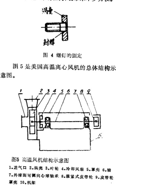5.從三角皮帶輪,這是利用皮帶輪的錐孔與開 口 的錐形套筒間的配合, 當(dāng)用螺 栓拉緊皮帶輪使其沿錐套表面 有微小 的位移 時 , 強迫錐形套筒內(nèi)孔收縮, 這就產(chǎn)生了對 軸的夾緊力而固定在軸上的。 其詳細結(jié)構(gòu) 已 在拙作 《一種裝拆快速 、 方便的 皮 帶 輪 結(jié) 構(gòu)》 ( 《化工裝備技術(shù)》 1 986 N O 9 期) 一 文中 已有說明此處從略。 6 。 聯(lián)接螺釘?shù)墓潭?, 離心 風(fēng)機渦 殼 前 后要 分別同機架與風(fēng)機進氣室 (蓋) 聯(lián)接, 其聯(lián)接螺釘 (不銹鋼 制) 是插入風(fēng) 機 渦 殼 (己之 4 ) 上事先鉆好的通孔 中再予 以封 焊 固 定的 (圖 4 ) 。 因此禍 殼的 流道 內(nèi) 壁 平 整, 而且 由于定位精度 較高業(yè)能與渦殼基本 保持垂直 , 這對風(fēng)機的拆裝帶來不少方便。