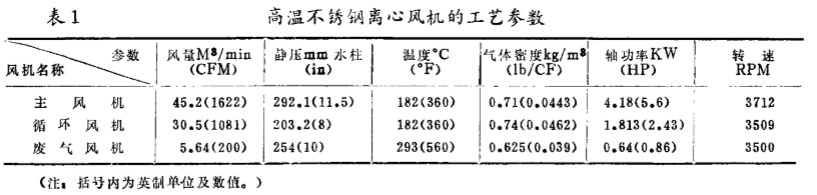 1 9 8 0 年 從 美 國Sfo r k 一 B o w e n 公司 引進的 整套干燥 裝置中有三 臺高溫不銹 鋼離心風(fēng)機 , 它們在 工 藝 條件下 的性能參數(shù)綜合為 表 1 。