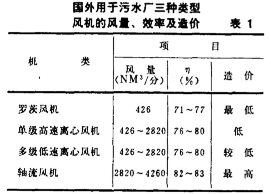 一 、 概況 表 1 是根據(jù)美國(guó)國(guó)家環(huán) 保局提供 的70 年 代末國(guó)外用于 污水 廠的三種 類型 風(fēng) 機(jī) 的風(fēng)量、效率和造價(jià)一 覽表 。