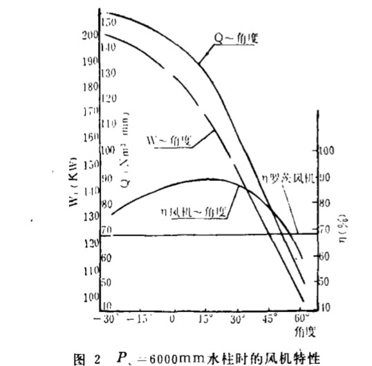 可 以看到, 高速離心風(fēng) 機(jī)加 裝進(jìn) 口導(dǎo)葉 片后 , 對(duì)應(yīng)于導(dǎo)葉片的每一個(gè)旋轉(zhuǎn)角度, 鳳 機(jī) 就有一條特性曲線與之 對(duì)應(yīng)。 對(duì)污水廠來(lái)說 , 由于曝 氣池水 深不 變, 則 離心風(fēng) 機(jī) 的出 口壓 力 尸?山瓶礊槌 數(shù) , 現(xiàn)將曝氣器到水面阻 力為55O0m m 水柱, 節(jié) 道阻 力為 500 m m 水 柱, 則 P 。為6 000 m m 水 柱, 在此 作一水平線 , 它和導(dǎo)葉片各開度 下 特性曲線的 交點(diǎn) , 就是 導(dǎo)葉片各開度 下的 1’ . 作點(diǎn), 可以 看到 , 隨 著導(dǎo) 葉片角度增 大, l; 作點(diǎn)左 移, 風(fēng) 量 明顯減 小, 只要 _ L作 點(diǎn)不進(jìn) 入 “喘振 區(qū) ” , 工作點(diǎn) 對(duì)應(yīng) 的風(fēng) 量范圍就是 離心風(fēng) 機(jī)的 風(fēng) 量調(diào)節(jié)范圍。根據(jù) 離心風(fēng)機(jī)的工作點(diǎn) , 可 以在 各對(duì)應(yīng) 一只 葉片開 度下 的電網(wǎng)輸入功率和風(fēng) 機(jī)效 率特 性曲線 上, 找 到該工 作點(diǎn)的 電網(wǎng)輸入 功 率牙 反J雙機(jī) 效率沖 , , 圖 2 就是根據(jù) 以 上 方 法 做 出的 尸。為6 o00 m m 水柱 條件 下 , 單 級(jí) 高 速 離心風(fēng) 機(jī)隨 導(dǎo)葉片 開度變化時(shí)的 風(fēng)量 , 功率 及 風(fēng)機(jī) 效 率的調(diào) 節(jié)曲線。 從 圖 2 可以看到 , 當(dāng)風(fēng) 機(jī)進(jìn) 口 導(dǎo)葉 片變化時(shí) , 單級(jí)高速離心風(fēng) 機(jī)的風(fēng) 量可 以 大幅度的加 以調(diào)節(jié), 在調(diào)節(jié)過 程中, 風(fēng) 機(jī)的效率下降不 大. 尤其在0 。 ~ 45 。 開度下, 風(fēng)機(jī)的效 率變化更小, 節(jié)能 效果更 好。 根 據(jù) 圖 2 的 曲線 , ‘ 列出了表 2 及表 3 所 示 的單級(jí) 高速離心風(fēng)機(jī)在滿開 度 及 0 。 ~ 45 。 開度下的 風(fēng) 量, 能耗及其相對(duì) 比值的數(shù)據(jù)。 表 3 反映 了滿 量 程內(nèi), 單級(jí) 高速離心風(fēng) 機(jī)的氣 量可減小 到滿量 程的 1鄺 , 此時(shí) 可 節(jié) 約 一半左右的能 耗, 在常用 0 。 ‘ 45 “ 范圍 內(nèi) ,