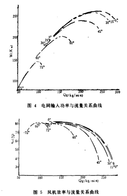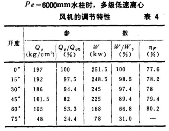 氣量可減 小到。“ 開 度的60 % 以 下, 能 耗可 一節(jié) 約。。 開度時(shí)的30 % 以上 , 單機(jī)節(jié)能效果十分 顯著。 杭州制氧機(jī) 廠生 產(chǎn)的單級(jí) 高速離心風(fēng)機(jī) 除 了可帶進(jìn) 口導(dǎo)葉片 、 用以 手動(dòng)調(diào)節(jié)之外 , 還 設(shè)計(jì)有。~ 10 m A D C 標(biāo)準(zhǔn) 信號(hào) 接口 , 它可 以接受控制 系統(tǒng)的信號(hào), 調(diào)節(jié)導(dǎo) 葉片開度的 大小 , 從 而使離心 風(fēng) 機(jī)成 為控制 系統(tǒng)的執(zhí)行 機(jī)構(gòu) , 自動(dòng)調(diào)節(jié)風(fēng) 量。 三 、 多級(jí)低速離心風(fēng)機(jī)的風(fēng)t 調(diào)節(jié)特性 及其節(jié)能效果 多級(jí)低 速離心風(fēng) 機(jī)的風(fēng) 量調(diào)節(jié)采用調(diào)節(jié) 進(jìn) 口蝶閥的方法實(shí)現(xiàn) , 圖3~ 5 畫 出 了多級(jí)低 速離心 風(fēng)機(jī)的風(fēng)量~ 出 口壓 力 ; 風(fēng) 量~ 電耗 ; 風(fēng) 量與風(fēng) 機(jī)效率的 特性 曲線。 從圖 3~ 5 的基本特性曲線簇可 以看到, 多級(jí)低速離心 風(fēng)機(jī) 風(fēng) 量 、 電 耗 、 風(fēng)機(jī) 及電機(jī) 效 率隨蝶閥 開度變化。 多級(jí)低 速離心風(fēng) 機(jī)的效 率曲線變化很小 , 風(fēng) 量 和 電耗二 條曲線有很 好的跟 隨特性 , 節(jié)能 效 果同樣十 分顯著 。 由圖6 可以列出蝶閥 不同 開度下, 氣量 、 電耗 、 效 率曲線, 其對(duì) 應(yīng)值數(shù)據(jù)見 表4 。