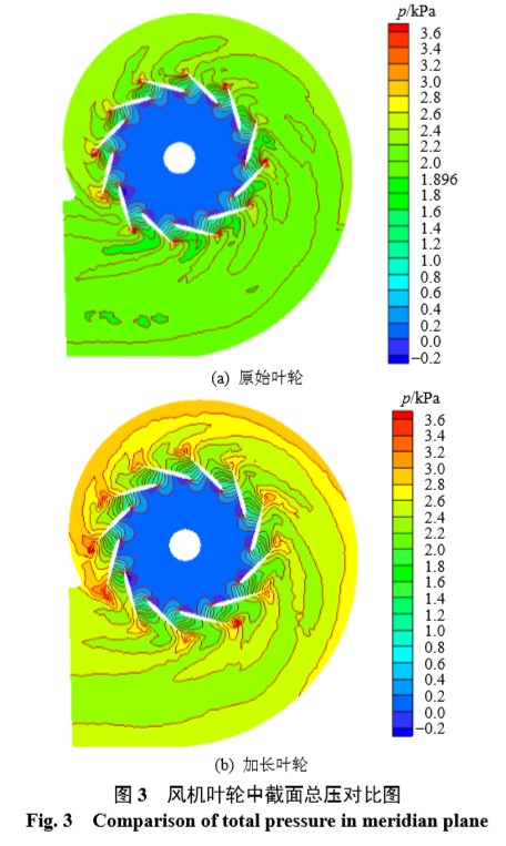 1.2 加長前后的內(nèi)流特征 原風(fēng)機葉片加長后,葉輪直徑也同時增大,而 由葉片式泵與風(fēng)機的能量方程式[1-2]可知,風(fēng)機的做 功能力與葉輪外徑成正比,因而氣流總壓在風(fēng)機內(nèi) 將顯著提高。 圖 3 和圖 4 表明,葉輪葉片加長后風(fēng)機中的氣 流自葉片加長部分附近,總壓明顯升高。而且,由 于風(fēng)機葉輪加大后,蝸殼尺寸并未改變,因而蝸殼 內(nèi)氣體的流通面積相應(yīng)減少,使得蝸殼內(nèi)氣體流速 加快,總壓進(jìn)一步增加。圖 3 和圖 4 還表明,葉輪 葉片加長的同時,蝸殼內(nèi)流場的均勻性也有所下 降,同時蝸殼內(nèi)氣流速度加快,使得蝸殼損失相應(yīng) 增加[12-13],將導(dǎo)致風(fēng)機效率有所下降。 圖 5 為葉輪葉片加長前、后蝸舌附近總壓分布 的對比圖。氣流在葉輪內(nèi)的壓力面和吸力面上,壓 力分布均為從葉片前緣至后緣逐漸增大。另外由于 氣體流動的連續(xù)性,且葉片加長前后風(fēng)機出口均設(shè) 定大氣壓強作為邊界條件,這使得葉片加長后對氣 體總壓的影響并不局限于加長部分之后,對加長部 分之前也會有影響。比較圖 5 中葉輪入口處的低壓 區(qū)可知,葉片加長后,葉輪入口處低壓區(qū)域的面積有所減少。