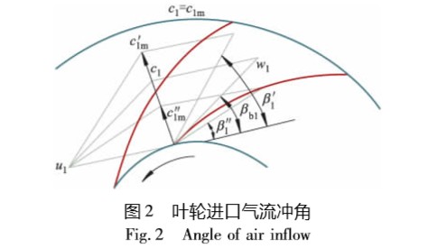2. 4 進(jìn)口導(dǎo)流器 如前所述,喘振產(chǎn)生的內(nèi)因是由于進(jìn)入葉輪的 氣流沖角增大而引起的旋轉(zhuǎn)脫離[14]. 圖2 為不同角度氣流進(jìn)入風(fēng)機(jī)葉輪時(shí)的狀 態(tài)[15]. 設(shè) β1 為氣流沖角. 圖中 βb1為葉片進(jìn)口安放 角; c1, u1, w1 分別為設(shè)計(jì)工況下的絕對(duì)速度、牽連運(yùn) 行速度、相對(duì)速度; c1m為軸面速度,即 c1 在軸面上的 投影; c'1m, c″1m分別為大流量和小流量時(shí)的軸面速度; β' 1, β″ 1分別為大流量和小流量時(shí)的氣流沖角. 由于葉 輪為徑向葉輪,軸面速度與絕對(duì)速度相等,即方向、 大小相同: c1m = c1.