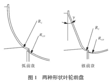 將弧前盤改為錐前盤時,錐前盤下 方實(shí)際上還都保留一個小圓弧,對于 8 號葉輪約為 30~40mm,就是現(xiàn)在錐前盤 的 RC,它比原來弧前盤的圓弧半徑 RC 小 很多,方便成型,相應(yīng)地錐前盤的進(jìn)風(fēng)口 圓弧半徑 RCO 也比弧前盤的 RCO 要小。在 保持葉輪進(jìn)出口直徑和寬度相同的條件 下,得到相應(yīng)的錐前盤錐角 γ,這樣相應(yīng) 的錐前盤就得到了,見圖 1。