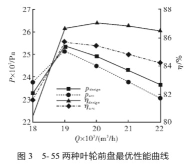 由于前盤形狀改變,相應(yīng)的錐前盤葉輪的葉 片型線,也要按弧前盤葉輪生成等當(dāng)量擴(kuò)張角 的葉片型線。這樣得到的錐前盤葉輪和原弧前 盤葉輪的其它葉輪參數(shù),如進(jìn)出口直徑、進(jìn)出口 寬度和進(jìn)出口角均相同,具有可比性。 2 5-55- 8 風(fēng)機(jī)性能數(shù)值預(yù)估對比 2.1 5- 55 基本設(shè)計(jì)參數(shù) 原 5- 55 設(shè)計(jì)參數(shù):流量為 20000m3/h;全壓 為 2500Pa;轉(zhuǎn)速為 1450r/min;工作溫度為 20℃; 弧前盤;葉片數(shù)為 16;等當(dāng)量擴(kuò)張角型線。 2.2 5- 55 弧前盤與錐前盤風(fēng)機(jī)性能對比 對 5- 55 風(fēng)機(jī)葉輪前盤按照弧前盤進(jìn)行建模 計(jì)算,并且對其進(jìn)行優(yōu)化,在最優(yōu)參數(shù)的基礎(chǔ) 上,得到弧前盤在不同工況下的性能曲線。再按 照進(jìn)風(fēng)口準(zhǔn)則,將風(fēng)機(jī)前盤由弧前盤改為錐前 盤進(jìn)行建模計(jì)算,得到同樣參數(shù)下錐前盤的雛 形(此時錐前盤尚未優(yōu)化)在不同工況下的性能 曲線,優(yōu)化后的弧前盤與錐前盤雛形的性能曲 線見圖 2。