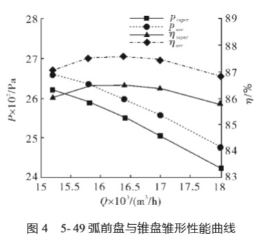 3.2 5-49 弧前盤與錐前盤風(fēng)機(jī)性能對比 對風(fēng)機(jī) 5- 49 按照同樣的方法得到弧前盤與 錐前盤雛形在不同工況下的性能曲線,見圖 4。