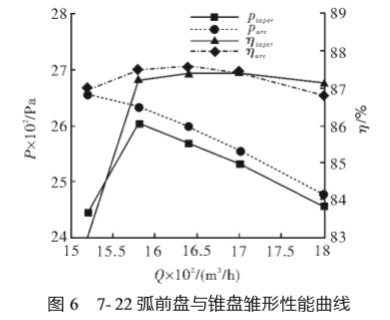 對于 7- 22 風(fēng)機(jī),從整體看兩者效率和全壓 性能均好,最高效率值均接近 87%,但對應(yīng)的流 量點(diǎn)位置不同,小流量時錐前盤的全壓和效率 均稍高于弧前盤,但大流量時,則剛好相反,兩 者全壓和效率的差別均在 1%左右。